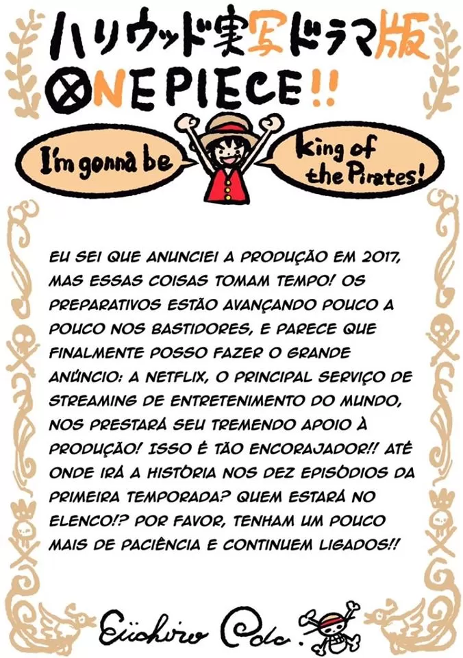 A Netflix oficializou a série live-action de One Piece, através de uma publicação informou que a série terá 10 episódios na sua primeira temporada. Confira a mensagem: