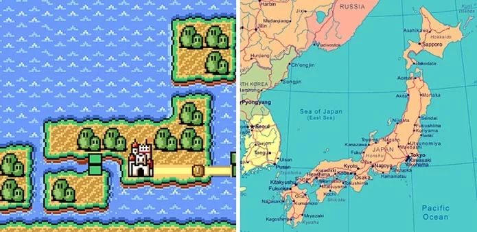 Em Super Mario Bros. 3, de Nintendinho, um dos mapas vistos no game tem seu formato inspirado no mapa do Japão, de uma ponta a outra, ainda que de forma mais contida e com alguns pequenos detalhes diferentes.