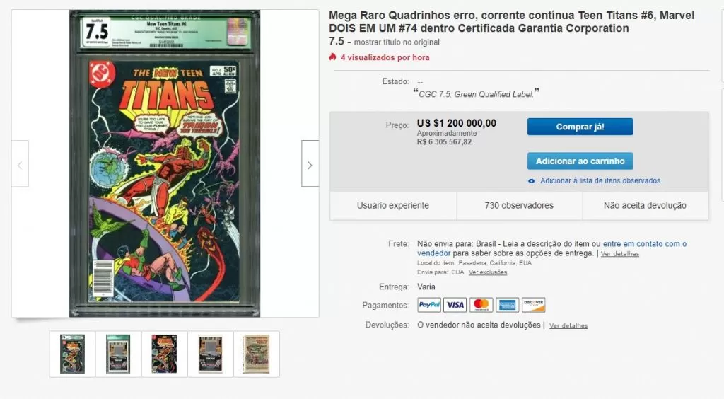 Uma HQ rara está sendo vendida por US$ 1,2 milhões por um motivo peculiar. A revista em questão trata-se de Os Jovens Titãs #6, da DC Comics, é isso que indica a capa. Por algum motivo, a história publicada dentro da revista é Marvel Dois em Um #74, da Marvel Comics.