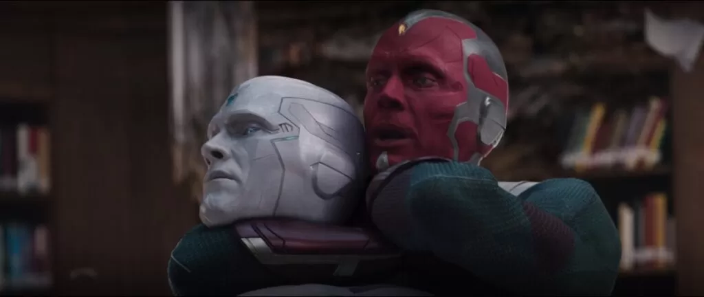 No momento em que há o embate entre os dois Visões, o Visão Branco permite que seu oponente mexa em seu circuito, e assim memórias do Visão original são inseridas em sua mente, trazendo flashbacks com cenas reais de filmes anteriores como Vingadores: Era de Ultron, Capitão América: Guerra Civil e até mesmo de suas duas mortes em Vingadores: Guerra Infinita.