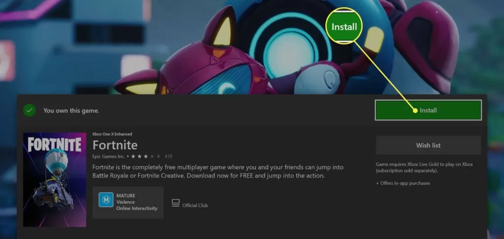 - Após o download, o jogo estará disponível na Home. O Fortnite mas ao contrário do PS4, é necessário ter a assinatura do Xbox Live Gold para jogar online.