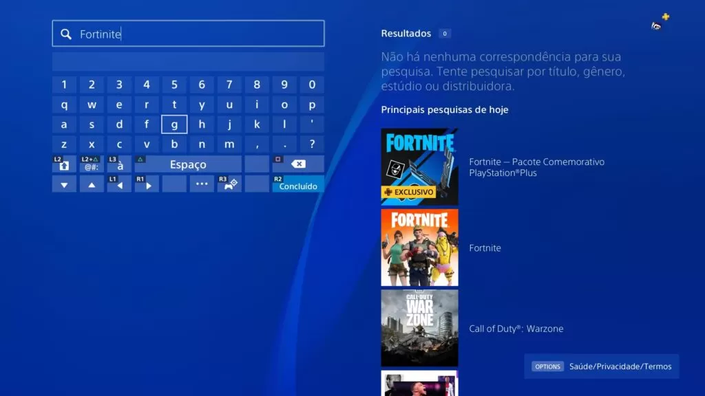 - Vá até a PlayStation Store, disponível no menu de jogos e aplicativos. Selecione na aba esquerda Pesquisar e procure pelo Fortnite.