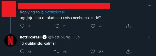 O perfil oficial da Netflix respondeu alguns usuários cobrando dublagem de JoJo’s Bizarre Adventure. Confira a resposta da Netflix: