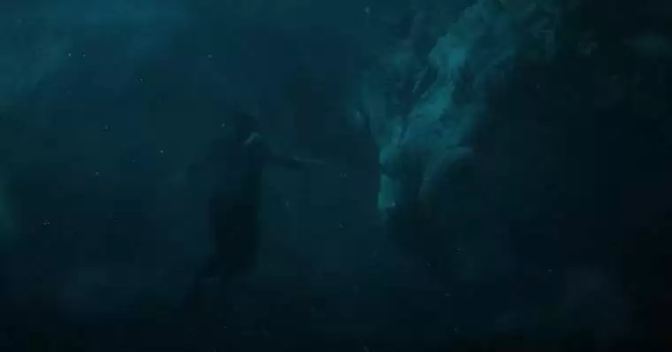 Um gigantesco dragão submerso encara Shang-Chi em uma cena impressionante da prévia. Por enquanto, sabemos apenas o seu nome que surgiu em outros materiais de divulgação: o Grande Protetor. Parece que ele será um forte aliado de Shang-Chi para despertar suas habilidades místicas.