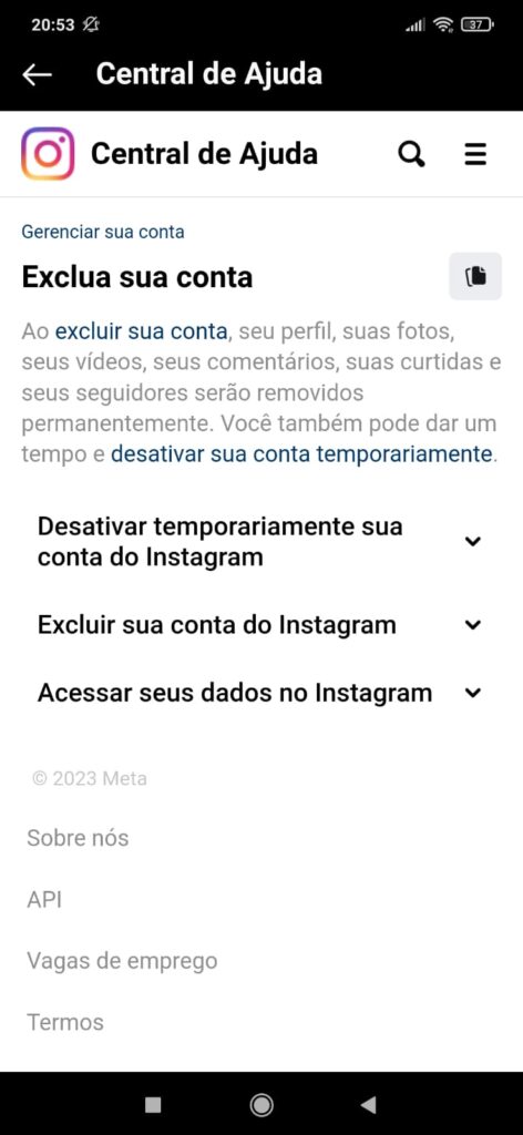 - Na Central de Ajuda, selecione “Gerenciar sua conta” e depois “Excluir sua conta”.