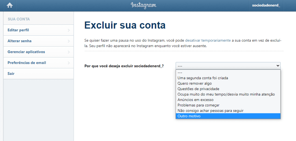 - Depois vai para “Central de Ajuda”, “Gerenciar sua conta” e por fim “Exclua a sua conta”, escolha o motivo pelo qual está desativando sua conta.