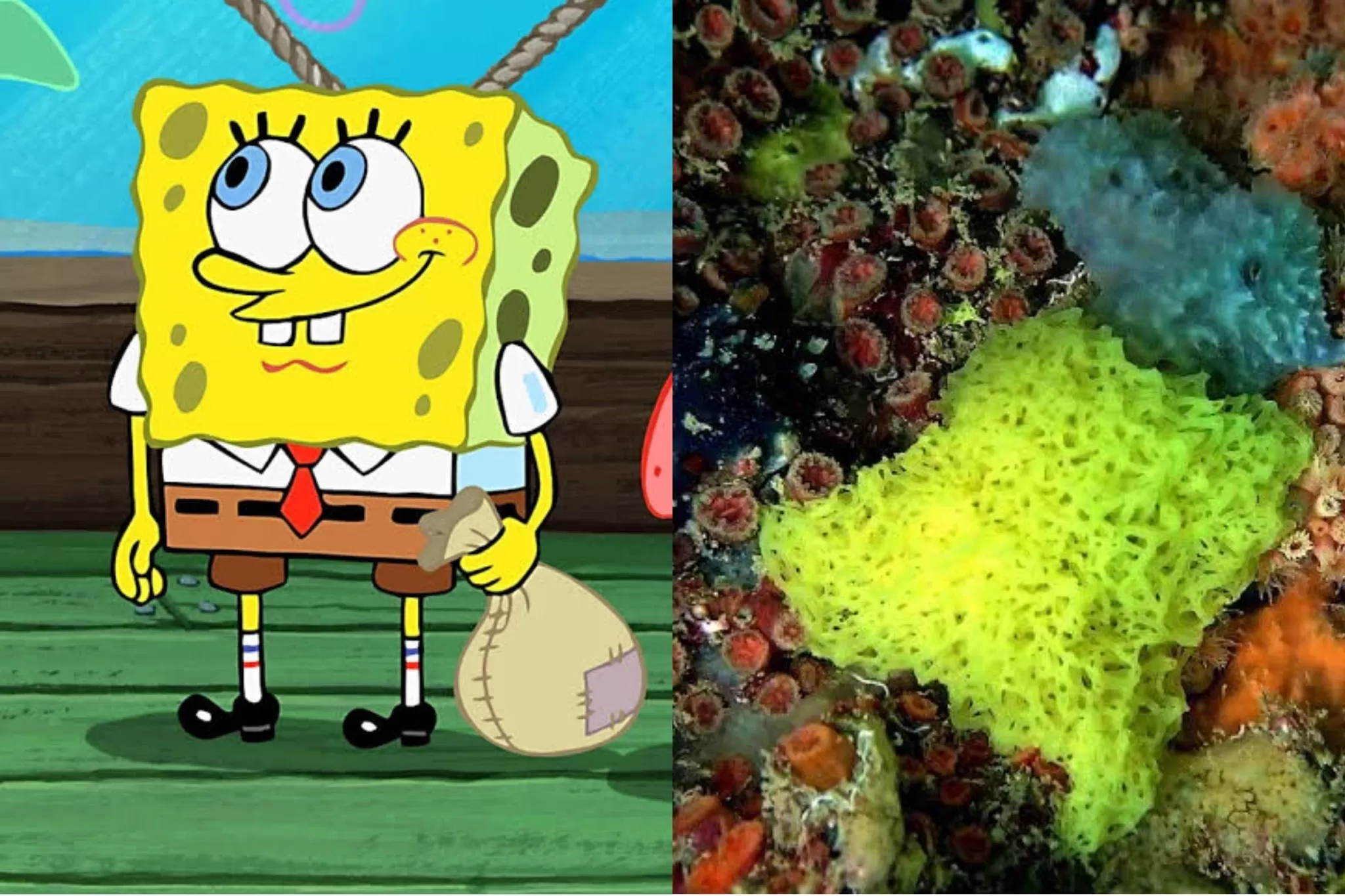 O protagonista do desenho, Bob Esponja, é inspirado em uma esponja-do-mar, mas seu design se assemelha mais a uma esponja de cozinha. Na natureza, as esponjas-do-mar são organismos filtradores, que vivem fixos em recifes e têm grande importância para o equilíbrio ecológico marinho.