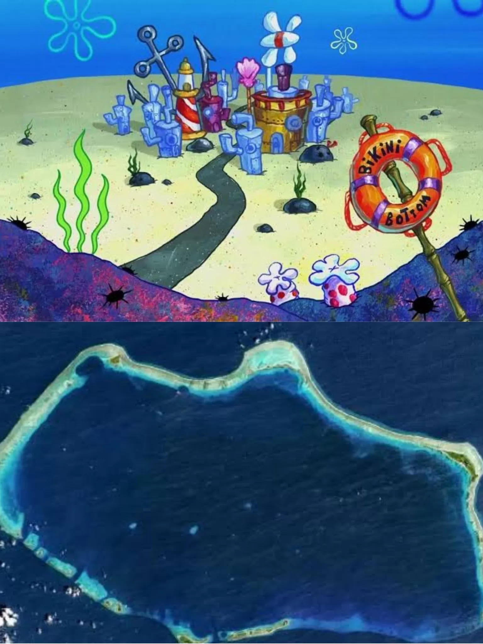 A Fenda do Bikini, onde se passa a história, pode ter sido inspirada no Atol de Bikini, um local no Oceano Pacífico onde foram realizados testes nucleares. Uma teoria popular sugere que os personagens do desenho desenvolveram inteligência e personalidades humanas devido à exposição à radiação. Na vida real, estudos mostraram que após os testes nucleares, peixes começaram a se adaptar ao ambiente contaminado, vivendo em destroços e objetos jogados no oceano, algo que se reflete na ambientação da série.