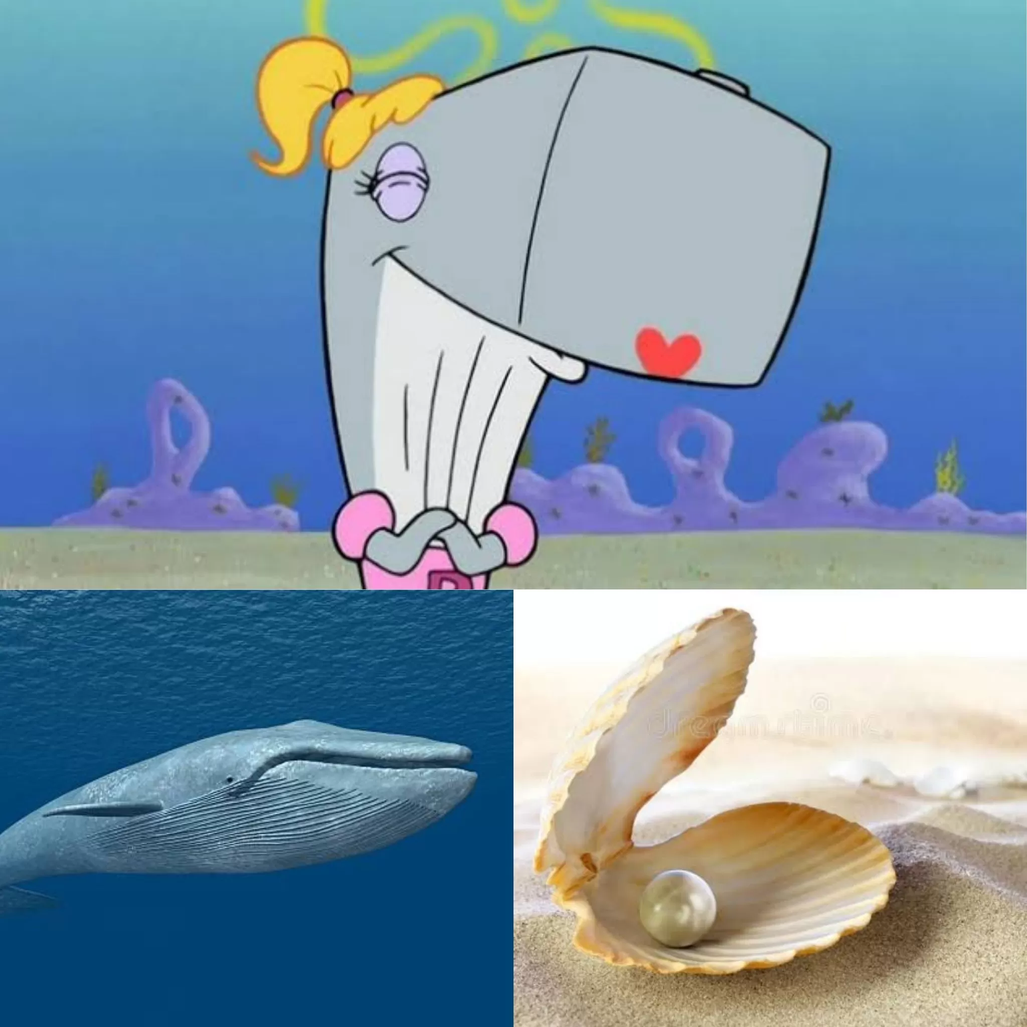 Pérola, a filha do Sr. Sirigueijo, é uma baleia, apesar de ser filha de um caranguejo. Seu nome é uma referência às pérolas que se formam dentro de ostras. Baleias são mamíferos marinhos enormes e inteligentes, e na série, Pérola tem um comportamento típico de adolescente.