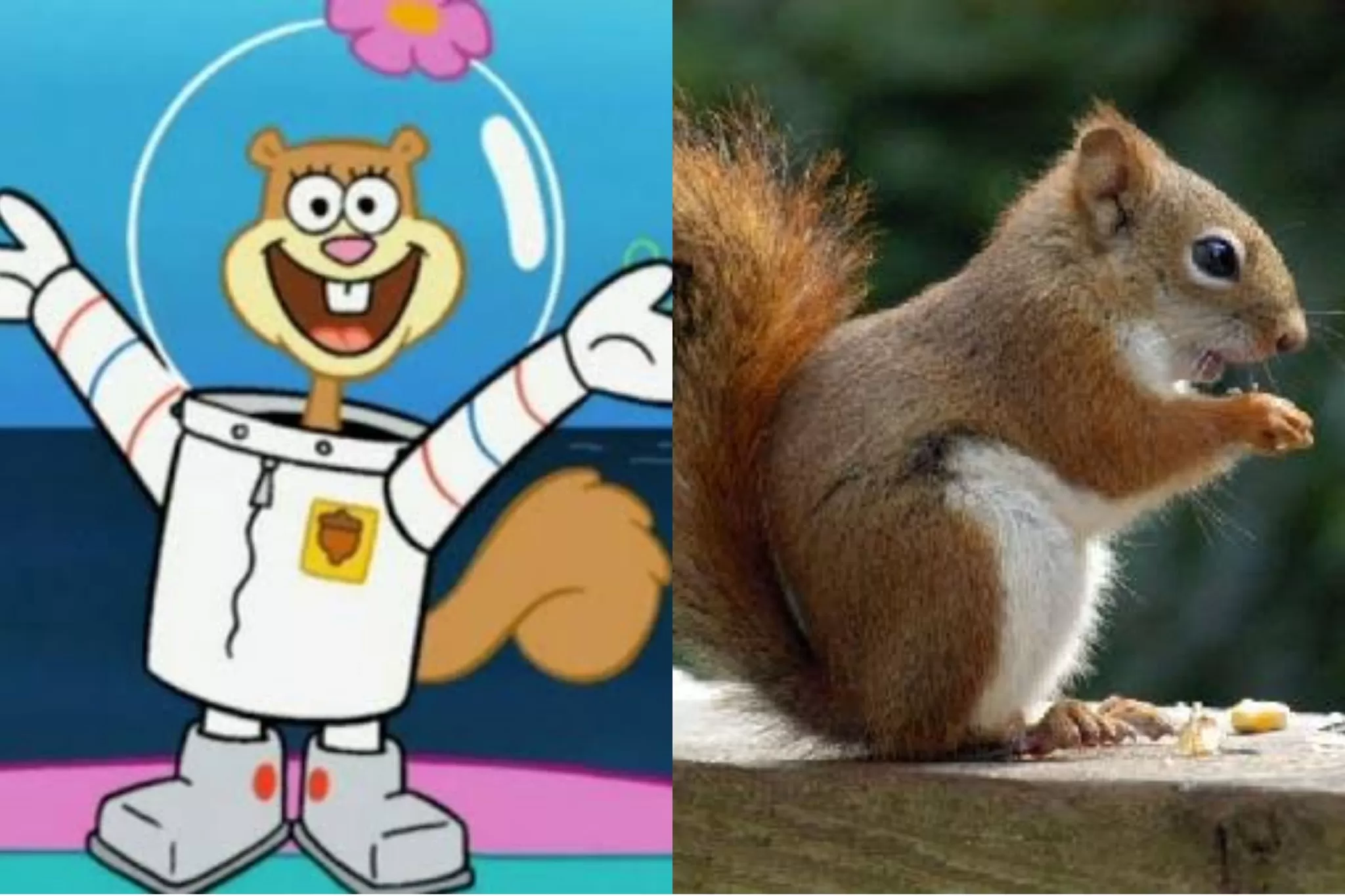 Sandy é uma exceção entre os personagens, pois é um esquilo vivendo debaixo d’água com um traje especial. Os esquilos são mamíferos terrestres ágeis e inteligentes. Na série, Sandy representa uma exploradora do mundo submarino, vinda do Texas.