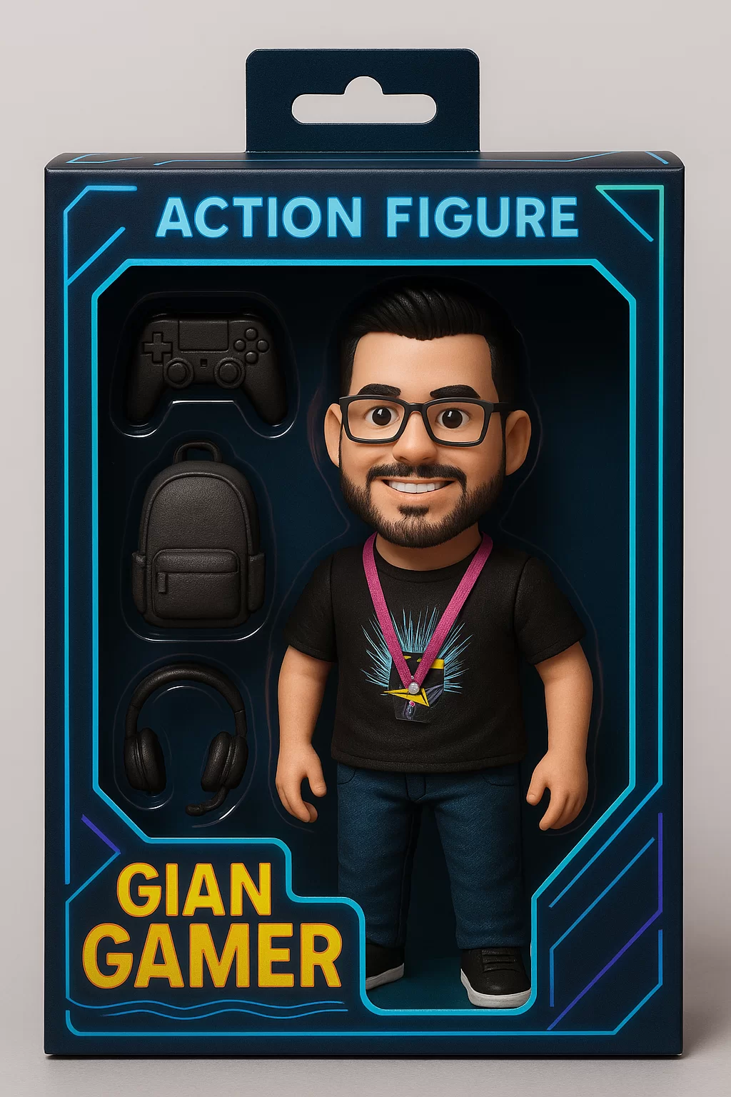 “Crie uma imagem de um boneco baseado na foto enviada. A caixa deve parecer com a de brinquedos vendidos em lojas, com visor transparente, suporte para pendurar e arte visual estilizada. Inclua o nome do boneco como ‘Action Figure Gian Gamer’. Na lateral, posicione seus acessórios: um controle de videogame, uma mochila e um headset. A caixa deve ter tons de azul e preto com detalhes em neon. O boneco deve estar sorrindo, com roupa casual geek.”